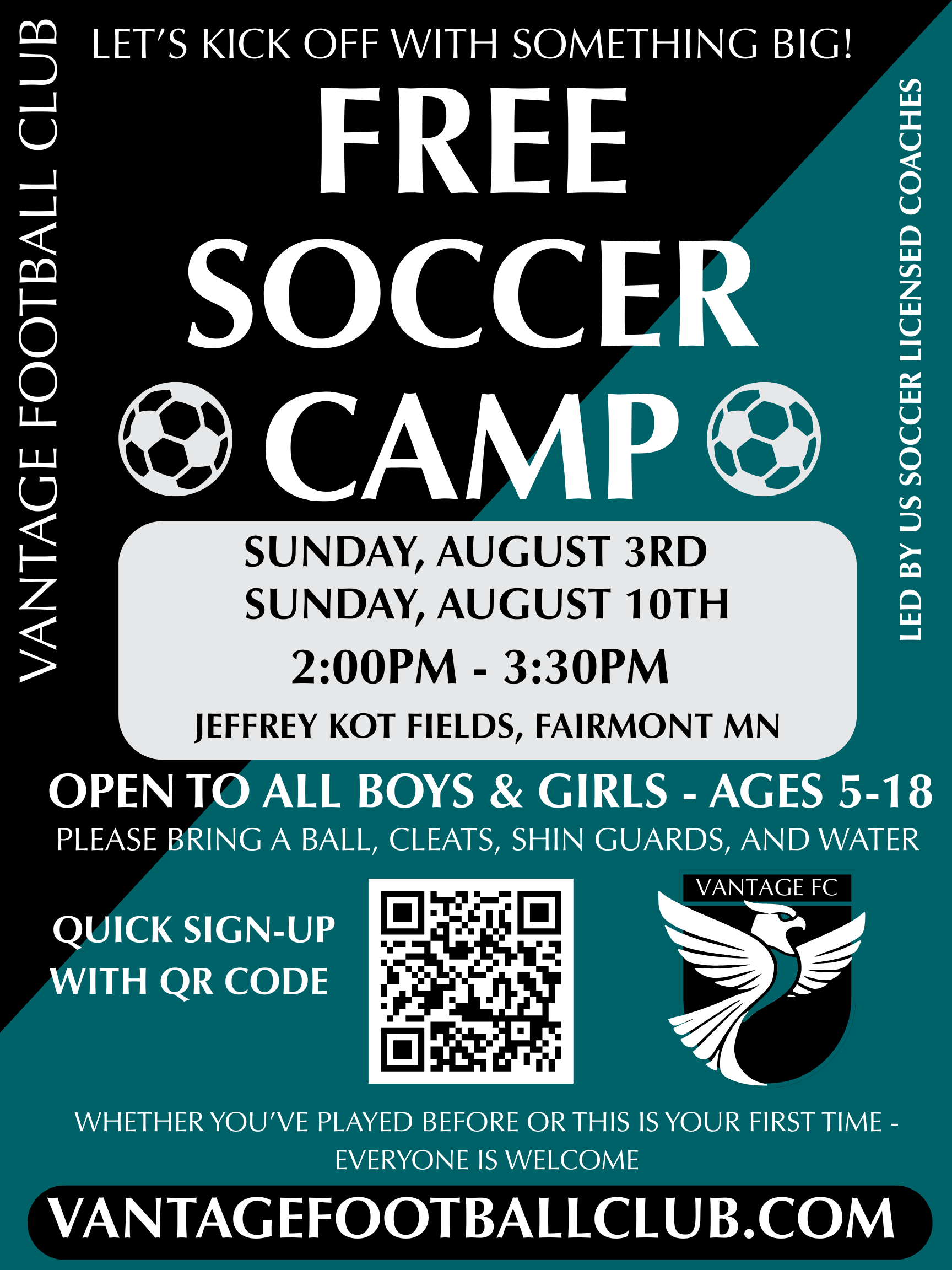 Come play, learn, and have fun with Vantage FC. Open to all players ages 18 and below - it’s completely free! Parents are encouraged to come to watch and learn abut the club. Sign up below!